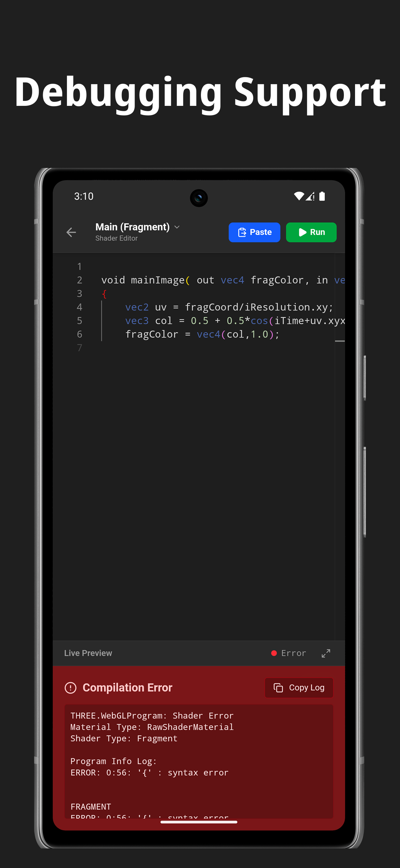 Protecting your creative work is important to us. Shaderboy does not store any of your data in the cloud. All your projects, code are stored strictly in your device's local storage. This means your data stays with you and is never uploaded to our servers.